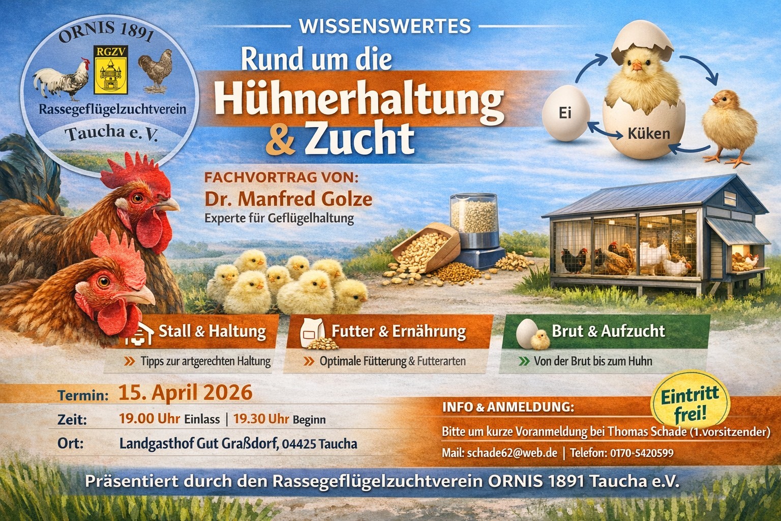 Dr. Manfred Golze, ein Experte der Geflügelzucht, spricht kurzweilig und anschaulich über Stall/Haltung, Futter/Ernährung, Brut/Aufzucht von Hühnern. Fragen "rund ums Huhn" werden gern beantwortet.