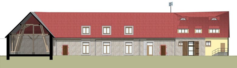 Mit Beginn der Hauptarbeiten übernahm die Firma MSN Lochasz Bau GmbH die Ausführung der Mauer- und Betonarbeiten. Vom alten Stallgebäude, das ursprünglich an dieser Stelle stand, sind heute nur noch wenige Mauerreste erhalten. Eine statische Nachnutzung der alten Feldsteinwände war nicht möglich, da sie sich als unzureichend tragfähig und zusätzlich stark mit Nitraten belastet erwiesen. Auch das Dachtragwerk war durch Schädlingsbefall stark geschädigt und musste vollständig abgetragen werden. Verwertbare Holzelemente werden später wieder eingebaut, andere originalgetreu ersetzt. Das hierfür vorbereitete Holz liegt bereits auf der Baustelle bereit.