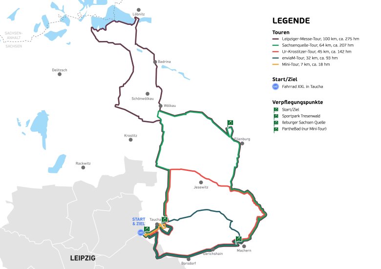 Start- und Zielbereich ist auf dem Gelände von Fahrrad XXL am Tauchaer Stadtrand. Hier findet den ganzen Tag über ein großes Familienfest mit vielen Attraktionen statt. Das Besondere: Während die Teilnahme an den Fahrradfest-Touren eine vorherige kostenpflichtige Anmeldung erfordert, kann das Familienfest spontan und kostenlos besucht werden.
