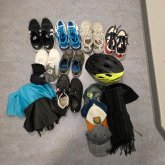 Schuhe, Regenschirme Fahrradhelm und verschiedene Base-Cup