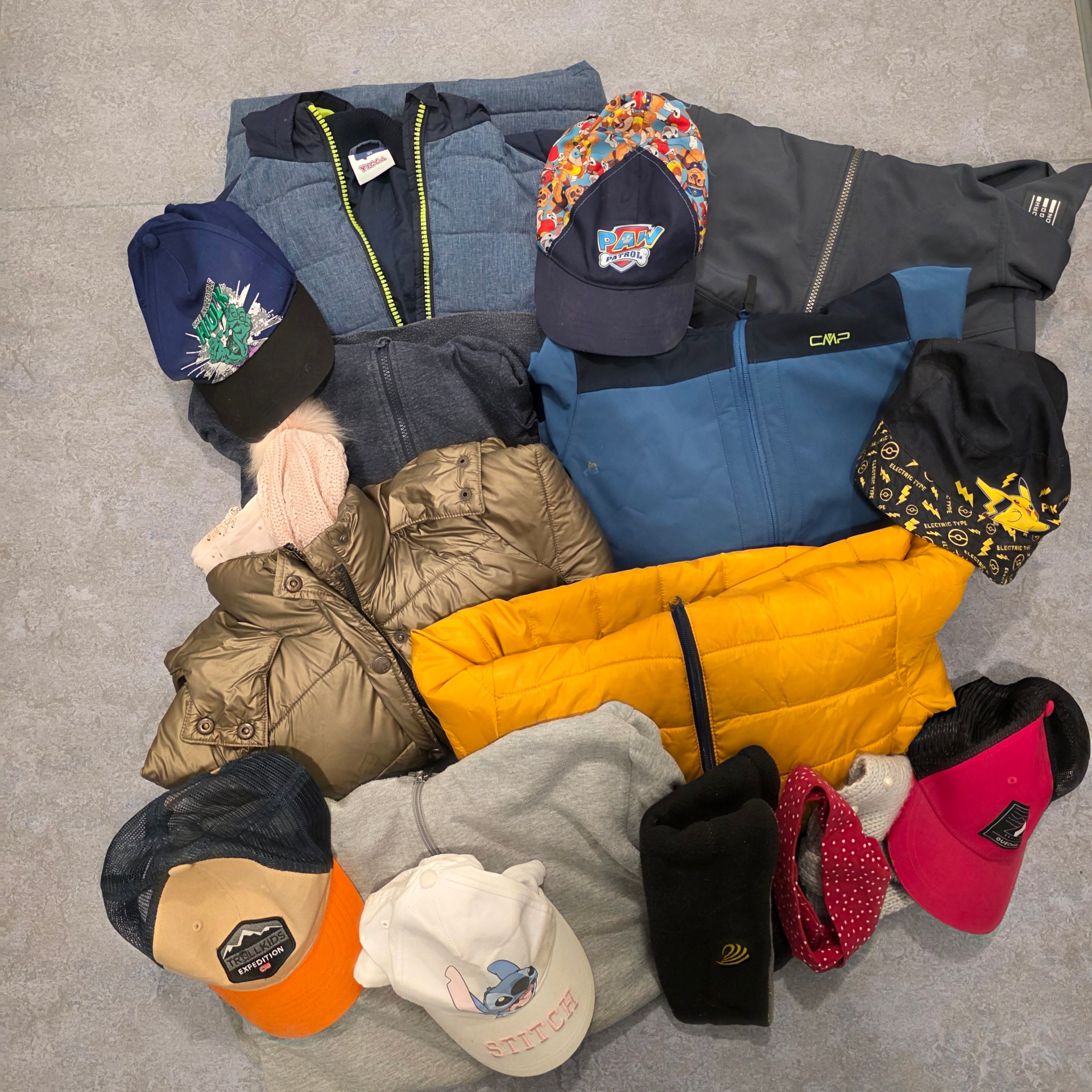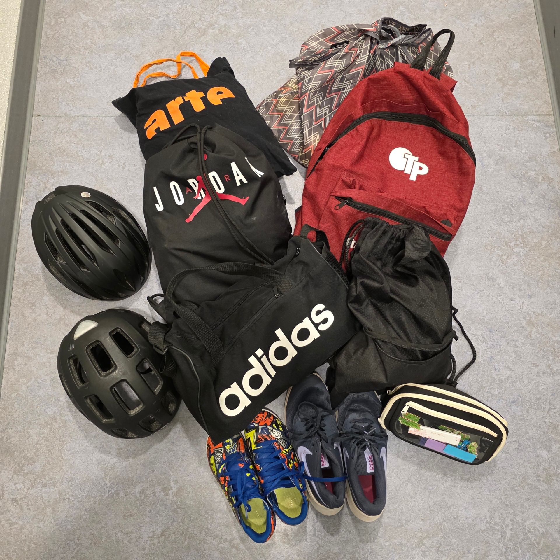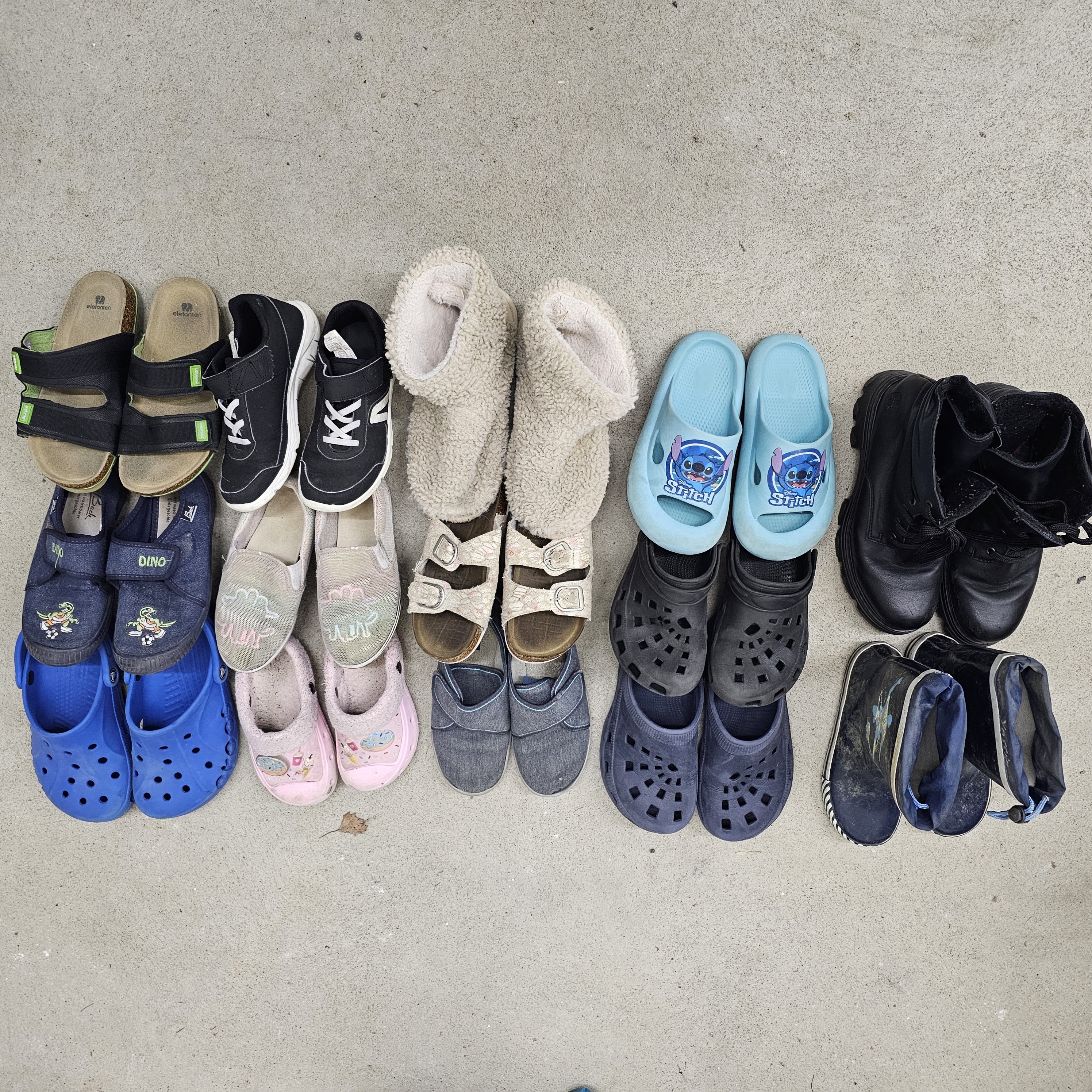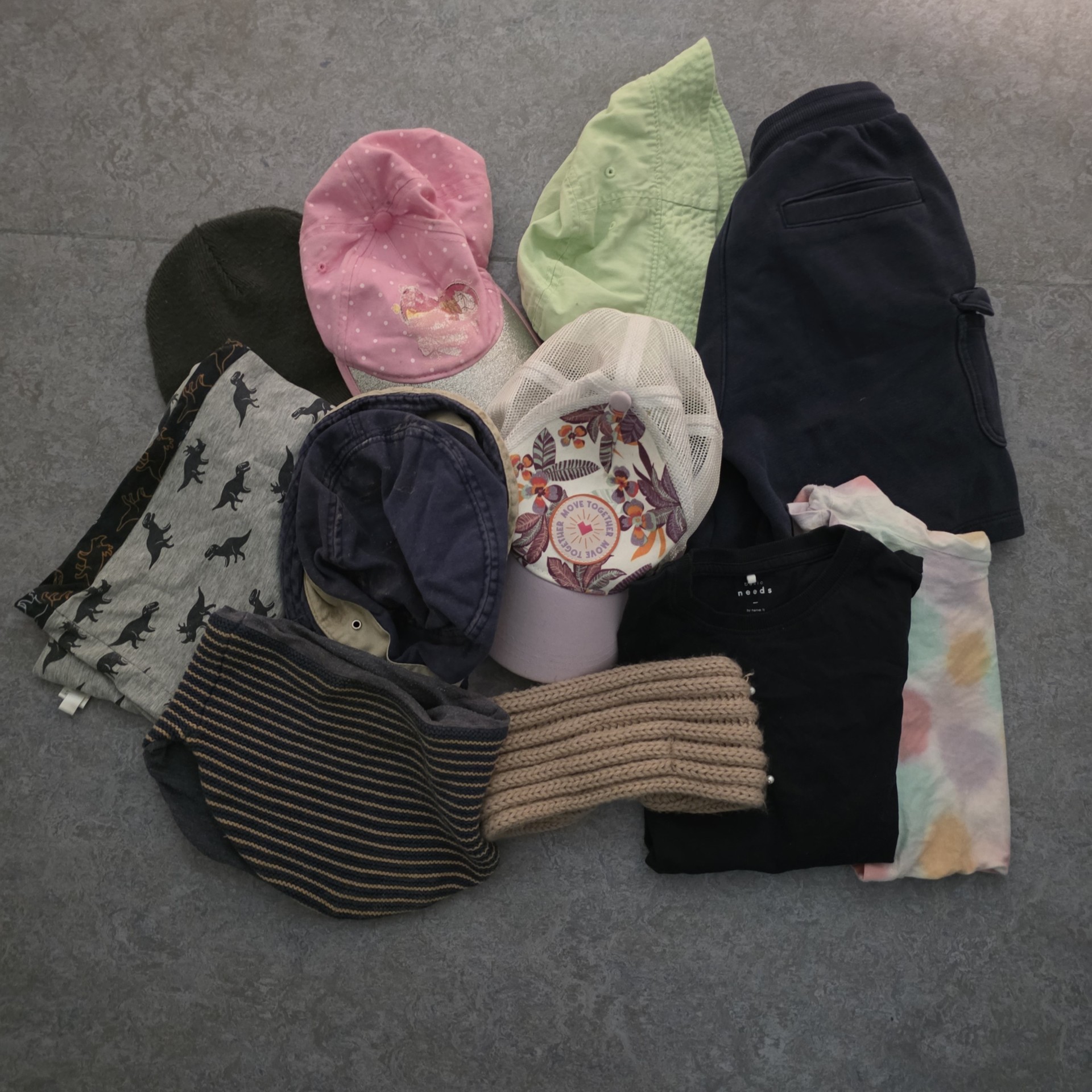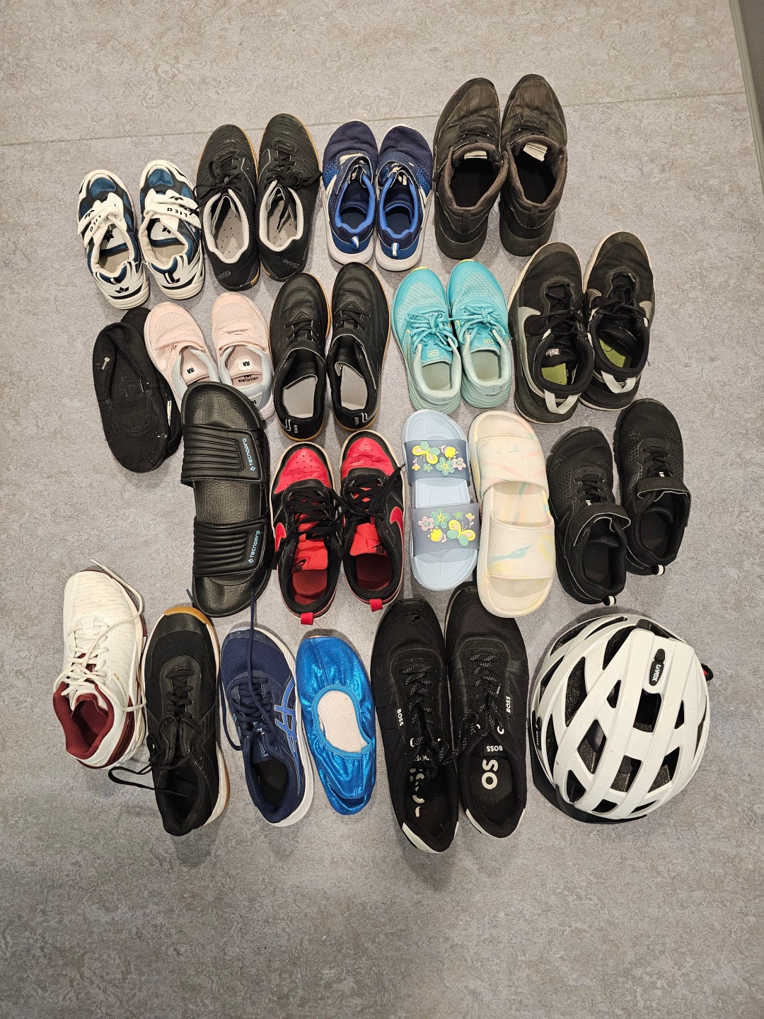 Schuhe, Regenschirme Fahrradhelm und verschiedene Base-Cup